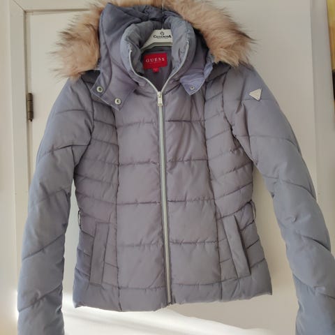 Tyylikäs uusi Guess -merkkinen naisten hieman pidempi toppatakki. Vyötärössä kiristin ja hupun karvareunus irroitettava.