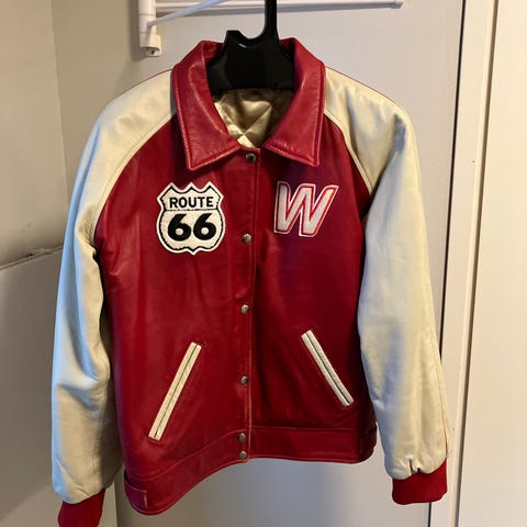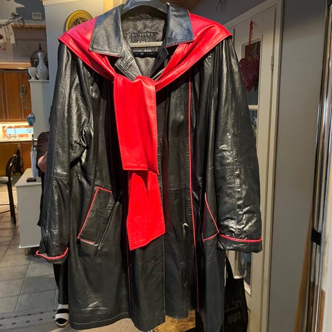 Nahkapaloista tehty pitkä nahkatakki jossa kauluksenreunassa kiertää karvareunus,samoin hihoissa.Kaunis ilmeikäs vuori.Napitus edessä.