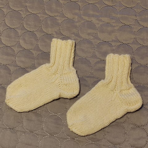 Itse tehdyt villasukat, pituus 15cm. Väri luonnonvalkoinen / lämmin valkoinen.