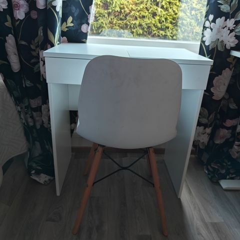 Ihastuttava, pieni kampauspöytä laatikolla ja kääntyvällä peilillä. Mukana myös jakkara. Lev.75, syv.50, korkeus 69, peilin kanssa 113.