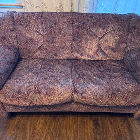 Elämää nähnyt sohva. Divaani osa kunnossa, hyvä istua. Keskimmäinen ja reunimmainen istuin osa kuopalla ja jousi rikki. Tänään haku!