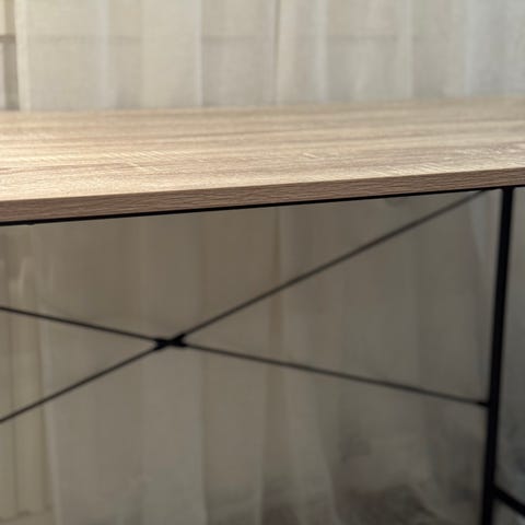 Ikean työpöytä Vika veine avattavalla kannella ja jalat. Pöydän pinnassa hieman kosteudesta johtuvaa jälkeä mutta ei häiritsevästi. Väri mustanruskea. Mukaan pöytään kuuluvat valkoiset säädettävät jalat.
