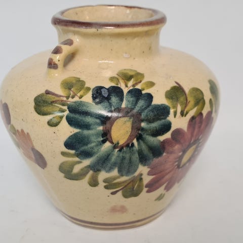 Kupittaan maljakko vihreää. Muoto on pyöreä ja siinä on kaksi pientä korvaa yläosassa. Pinta on mattapintainen ja yksivärinen. Pohjassa on Made in Finland-leima. Sopii sisustusesineeksi tai kukkamaljakoksi. Huomioitava mahdolliset pienet käytön ja iän jäljet, kuten reunassa näkyvä lohkeama tai kuluma.