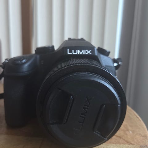 Panasonic Lumix digitaalikamera, jossa kääntyvä näyttö ja integroitu kädensija. Kamerassa on kiinnitettynä Rode-merkkinen ulkoinen mikrofoni, joka sopii esimerkiksi videokuvaukseen ja äänen tallentamiseen kameran päältä. Runko on musta ja siinä on useita säätöpainikkeita ja -rullia valotuksen ja kuvausasetusten hallintaan. Objektiivissa on etusuojus. Kokonaisuus soveltuu valokuvaukseen ja videokuvaukseen, kuten vloggaukseen tai muuhun sisällöntuotantoon, jossa tarvitaan kameran ja mikrofonin yhdistelmää.