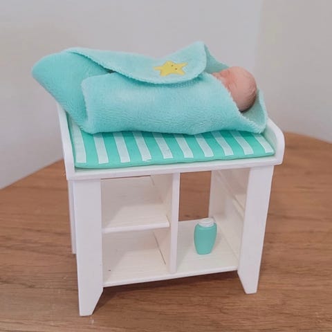 Mukana hoitopöytä ja sen pehmuste, huopa, rusettipanta ja voidepurkki.
