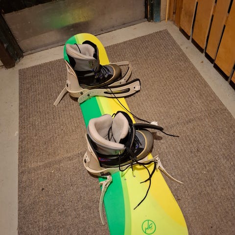 Crazy Creek 155cm lumilauta siteillä. Laudan keskelle siteiden väliin laitettu liukuesteet. Lumilautakengät (koko 38), joissa käytön jälkiä, mutta hyvin ajavat asiansa.
