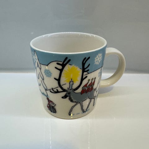 Arabia Muumi Talvimetsä muki. Vuoden 2012 talvisesonkimuki. Käytetty, mutta moitteeton kunto. Tarraa ei ole.