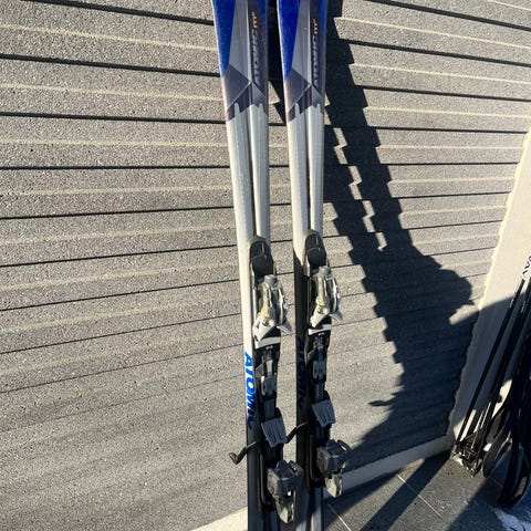Atomic laskettelusukset siteillä, pituus 180 cm. Sukset ovat siniset mustin ja valkoisin yksityiskohdin. Suksissa on integroidut säädettävät siteet, jotka sopivat alppimonoon. Soveltuvat rinnelaskuun aikuiselle hiihtäjälle. Pituusmerkintä ja muut tekniset tiedot näkyvät suksen kärjen läheisyydessä.