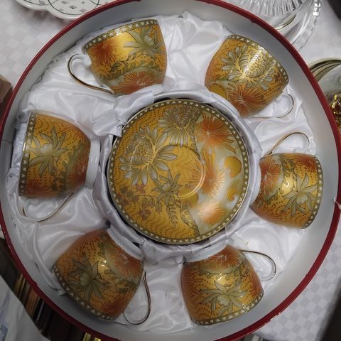 Posliininen espressokuppisetti, jossa kaksi pientä kuppia ja kaksi aluslautasta. Sekä kupeissa että lautasissa on värikäs maisemakuviointi ja kultareunat. Sopii esimerkiksi espresson tai muun pienen kahvijuoman tarjoiluun. Kuppien ja lautasten muoto on kapea ja korkea, ja korvissa on kultainen viimeistely.