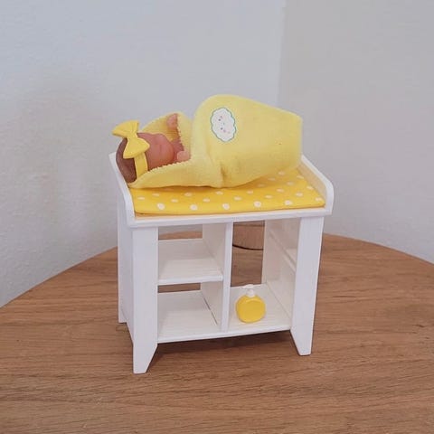 Mukana hoitopöytä ja sen pehmuste, huopa ja voidepurkki.
