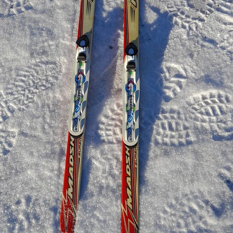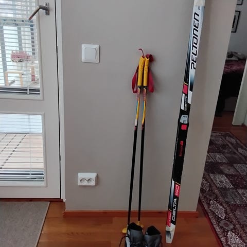 Peltonen sukset 110cm, sauvat, monot 21cm.