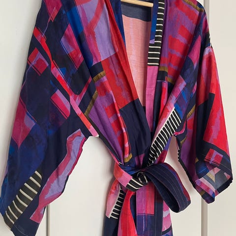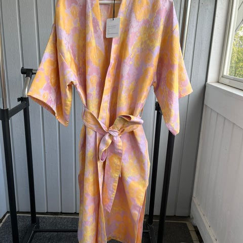 Oikein siistissä kunnossa oleva, vain pari kertaa juhlissa käytetty kimono. Pitkä vyö joka menee pari kertaa vyötärön ympäri ja sivuhalkiot. Puhdas, kuvissa rypyssä kun on ollut säilytyksessä. Koko M, mutta menee hyvin S-L-koossa. Myyn koska ei enää mahdu itselle.