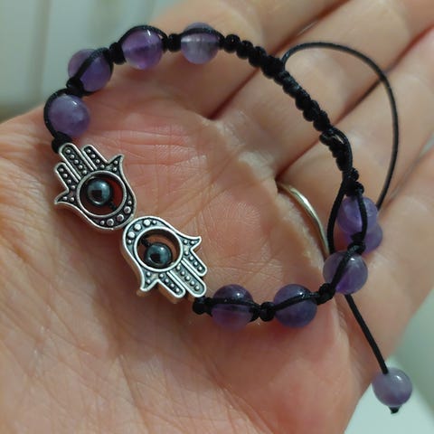 Snowflake obsidian pääkivenä,seka kaksi pienempää hematiittiä hamza käden sisässä.