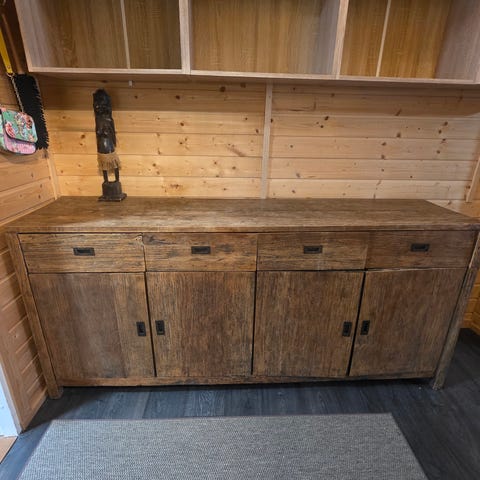 Ainoat käytön jäljet ovat punertavat jäljet keskimmäisellä hyllyllä (katso kuva). Muuten senkki on kuin uusi.