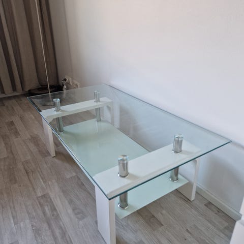 Sohvapöytä Jyskistä. Alkuperäisessä pienempi lasinen taso myös alempana, kuvassa näkyy kiinnityskohdat.
