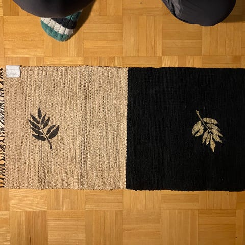 Mitat 95 cm x 46 cm. Päädyissä kaksi ruskeaa raitaa, keskellä kuusi murretun valkoisen väristä raitaa. Päärmätty käsin.