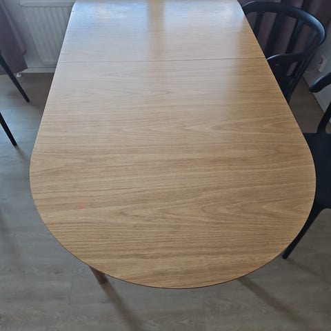 Luonnonpuusta valmistettu, lämpimän sävyinen ruokapöytä. Pöytä pidennetään 180 cm:iin. Mukana kaksi tuolia. Siinä on muutama naarmu, jotka näkyvät kuvassa.