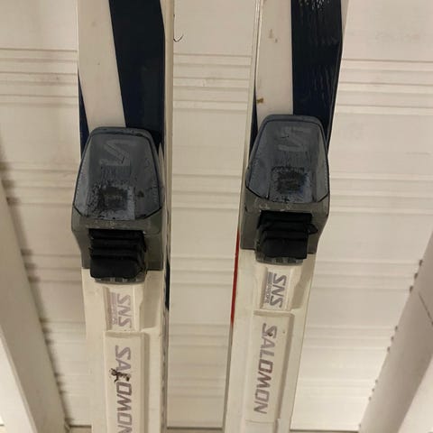 Peltonen Vectra maastohiihtosukset. Suksissa on keltainen ja sininen väritys sekä siteet, joissa lukee SNS Profil. Sopivat perinteiseen maastohiihtoon.