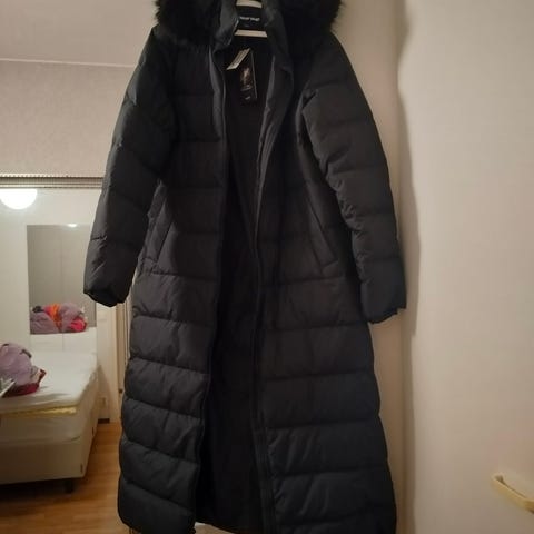 Marks & Spencer M&S Collection naisten untuvatakki koossa XXL, kai-kai 64 cm, pituus 64 cm. Musta, kevyesti topattu takki, jossa vaakasuuntaiset tikkaukset. Edessä vetoketjukiinnitys ja korkea kaulus. Takissa on irrotettava tai sisään taittuva huppu. Materiaalina untuva. Sopii ulkokäyttöön viileämpiin säihin.