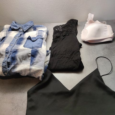 Myydään kolme toppia vaatepakettina koolle 34/xs. Crop top. Mukana pienet shortsit. Shorteissa vyötärön sisäpuolella pikku repeämä koska vyötäröltä leikattu elastinen nauha pois. Muuten toimivat ja mukavat. Postitus onnistuu.