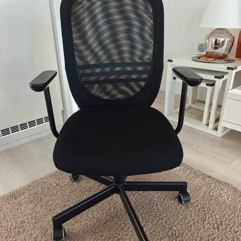 Erittäin siistikuntoinen Ikean Flintan työtuoli käsinojilla. Väri musta. Mukana ristiseläntukityyny.