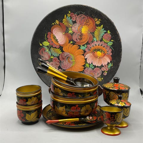 venäläinen, lusikat, astiat, kaadin, kulhot, lautanen, lautaset, koriste, värikäs, vanha wanha vintage käsintehty käsinmaalattu käsinmaalattu, kupit, kuppi, keittiötarvikkeet, muki, kukkakuvio, aterin, perinteinen, tarjoilulautanen, vintage, aterimet, khokhloma, neuvostoliitto ussr puuta puinen sisustus keräily
