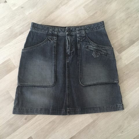 H&M farkkuhame naisille, koko 38. Suora, lyhyt malli. Edessä vetoketju- ja nappikiinnitys sekä etutaskut, takana paikkataskut.