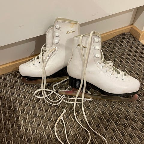 Doremi taitoluistimet, koko 36. Valkoiset nauhalliset luistimet, korkea varsi ja ruskea pohja. Terät kiinnitetty ruuveilla pohjaan. Soveltuvat muuhun luisteluun, esimerkiksi harraste- tai kenttäluisteluun. Lasten koko 36.