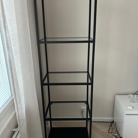 Ikean Vittsjö hylly. Pientä kulumaa päälilevyssä ja toisella puolella yläreunassa tarra edellisen omistajan jäljiltä. Koiratalous.
