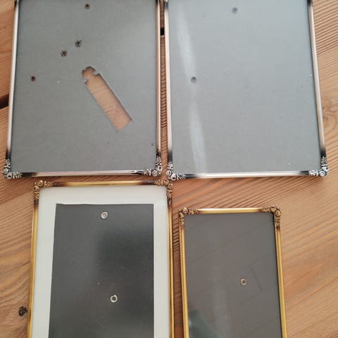 Valokuvakehyksiä 30 kpl. Kehyksen koko 16,5 cm x 16,5 cm. Osassa kehyksistä kulmatarrat. Säädettävä korkeus. Käytetty häissä pöytänumeroissa sekä esim. baaritiskillä. Osassa ”laseissa” naarmuja.