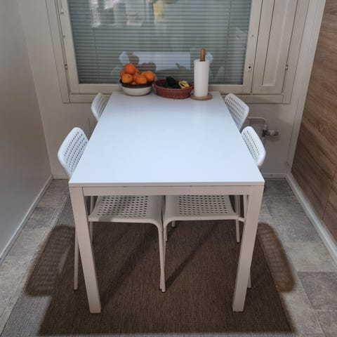 Ikea suorakulmainen pöytä. Pöydän mitat ovat noin 125 cm (pituus), 74 cm (leveys) ja 73 cm (korkeus). Väri on valkoinen. Pöydässä on neljä suoraa jalkaa ja sileä kansi. Sopii esimerkiksi ruokapöydäksi, työpöydäksi tai yleiskäyttöön kotiin tai toimistoon.