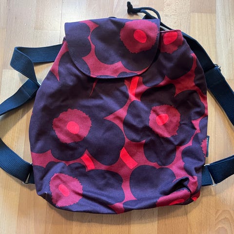 Marimekko Mono Unikko reppu. Toisessa olkahihnassa kangas hieman rispaantunut, muuten oikein siistissä kunnossa.