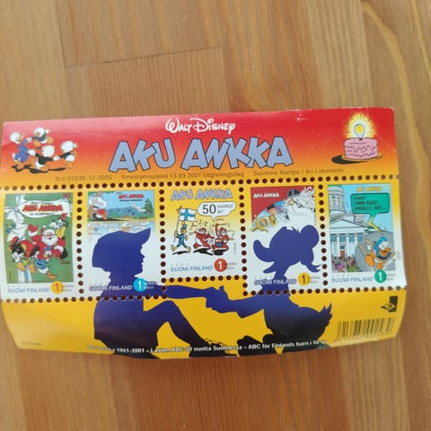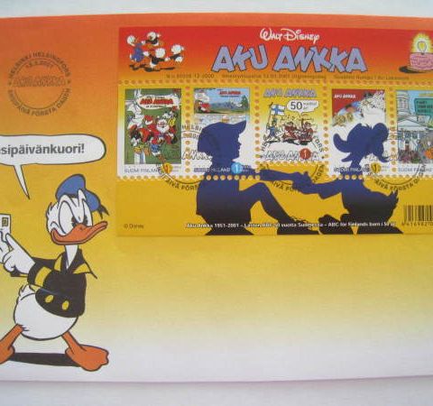 Aku Ankka postimerkki. Lasten ABC 50 vuotta Suomessa. Ensipäiväkuori 2001. Mukana mm. Don Rosa. Myynnissä kaksi kuorta. Hinta kappaleelta.
