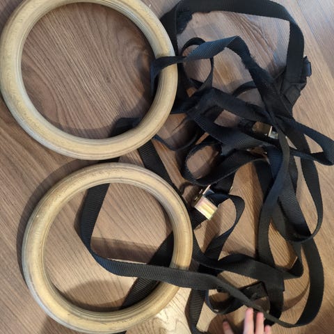 Puiset voimistelurenkaat. Renkaissa on säädettävät kiinnitysremmit ja soljet korkeuden säätöä varten.