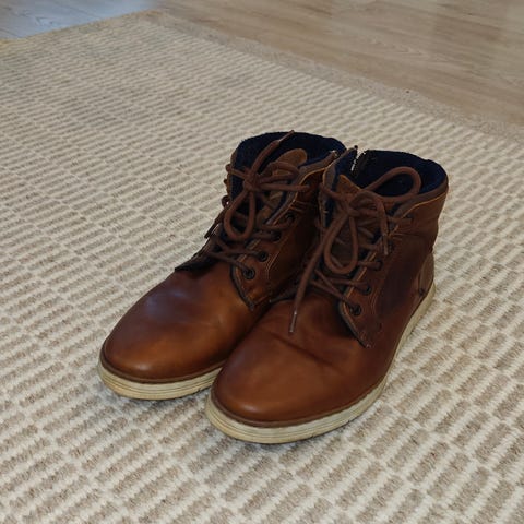 Björn Borg Boaz Hgh Fur men talvikengät, koko 41. Ovh 130 euroa. Ruskeat / tan nauhalliset nilkkapituiset kengät, joissa on lämmin vuori ja paksu kumipohja karkean kuvioinnin ansiosta. Päällinen on sileää ja pintanahkaa, sivussa vetoketju helpottamassa pukemista.