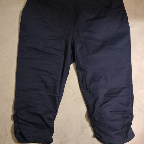 Raiski naisten mustat caprishortsit koko D46. Edessä vetoketju ja nappi, vyölenksut, sivutaskut, yksi takatasku, lahkeensuissa pienet halkiot. Ohutta joustavaa 96 % polyesteriä, % elastaania. Caprit hyväkuntoiset, reilu D-mitoitus.
