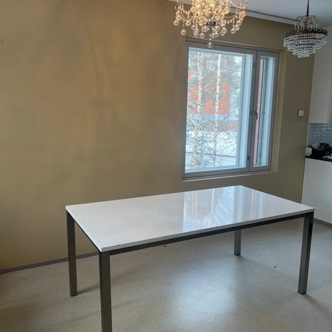 Myydään hyväkuntoinen ja tukeva ruokapöytä. Lisäksi haluavalle 3 kpl kuvissa näkyviä tuoleja. (Tuolien yhteishinta 50€)
