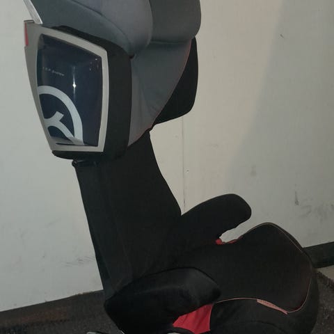 Cybex istuinkoroke. Musta lasten istuinkoroke, jossa korkea selkänoja ja sivutörmäyssuojat. Istuimessa on pehmustetut sivutuet ja pääntuki, sekä käsinojat. Päällinen on kangasta ja irrotettavissa pesua varten. Yhdessä kuvassa näkyy repeämä kankaan saumassa käsinojan kohdalla