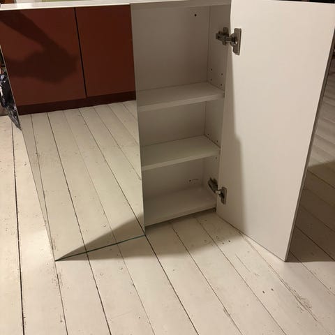 Kuvien mukainen Kankarkin Kalusteen yläkaappi jäi tilanpuutteen vuoksi asentamatta. Leveys 90 cm, korkeus 70 cm ja syvyys 15/24 cm. Kaapissa on lasihyllyt, 5 kpl LED valoja ja 1 suko pistorasia. Peiliovien peilit ovat 2-puoleiset.