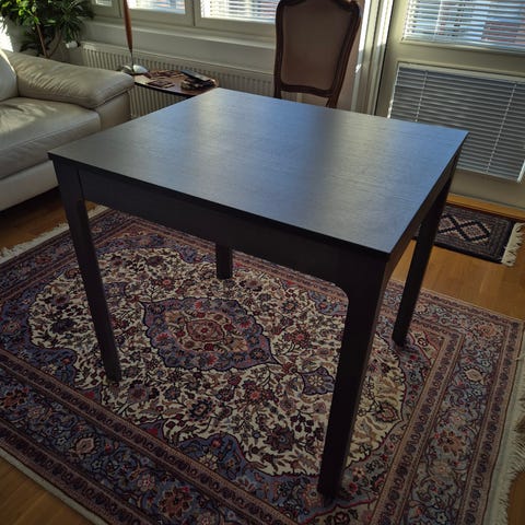 Pöytä on hyvässä kunnossa ilman näkyviä vaurioita, muutamia tummia jälkiä tasossa, jotka puhdistettavissa. Jalkoja suositellaan hieman kiristettäviksi (irroitettavissa kuljetukseen).