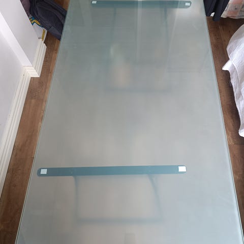 Kauniin pelkistetty ja tukeva lasikantinen pöytä vaikka työ- tai sivupöydäksi.