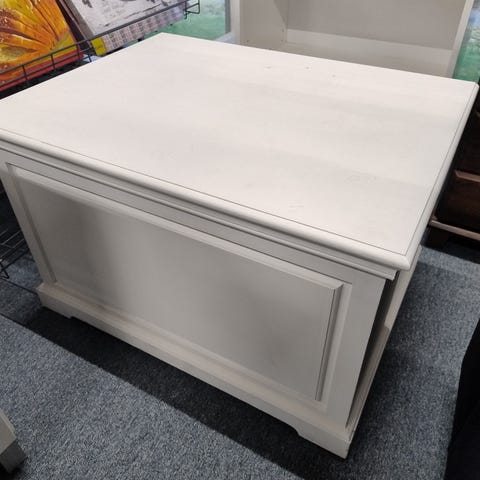 Männystä valmistettu arkkupöytä. Kannessa hieman jälkiä, mutta ei mitään suurempaa. Yksi jalka on irti, mutta sen saa pöydän alle laitettua, vain liikuteltaessa toki haittaa. Kuvissa sisäpuolella glitteriä, mikä tietenkin siivotaan pois.