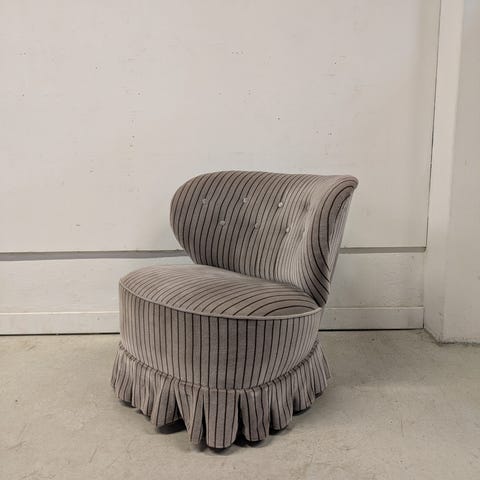 Vintage Emma - tuoli 1960- luvulta. Hyväkuntoinen.Nojatuolissa on korkea selkänoja ja pyöreä istuinosa. Verhoilumateriaalina on keltainen kangas, jonka alaosassa on laskostettu helma. Tuoli ollut vain lämpimissä sisätiloissa.