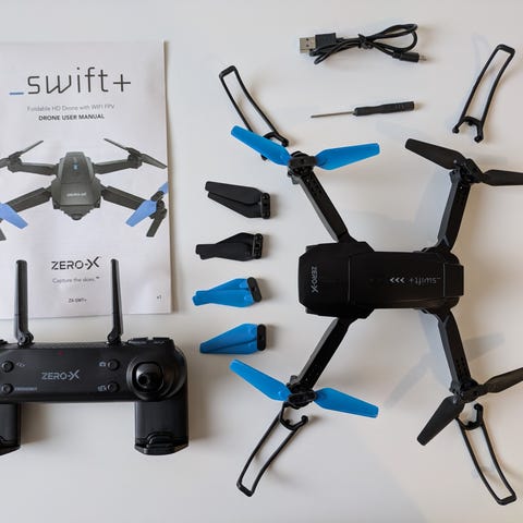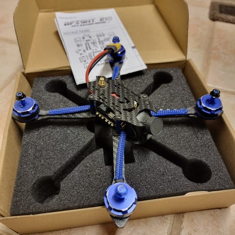 Skyzone FPV-lasit antennilla ja erillisellä akulla. Paketissa on säädettävällä hihnalla varustetut lasit, vastaanotinantennit, sekä akku johtoineen. Edessä myös kamera, laseja ei tarvitse riisua joka kerta.