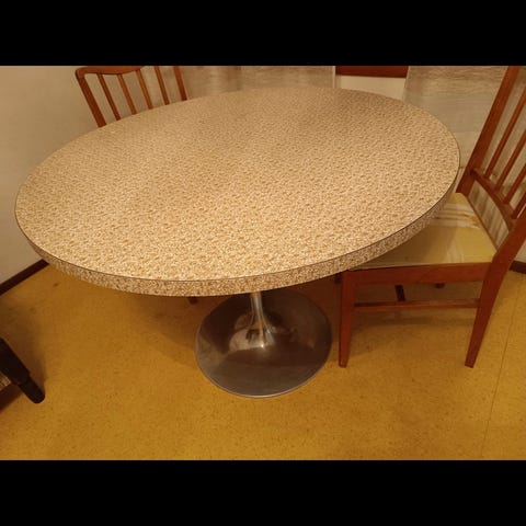Myydään vanha pyöreä ruokapöytä. Halkaisija 110cm. Pöydän pohjalla on jatkopala jolla saa levitettyä pöydän. Jatko pala tuo pöytään 30cm pituutta lisää.