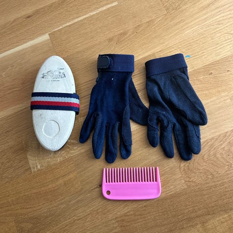 Kentucky hevosenhoitosetti, joka sisältää 2 paljon käytettyä harjaa ja kaviokoukun sekä kiillotuslapasen.