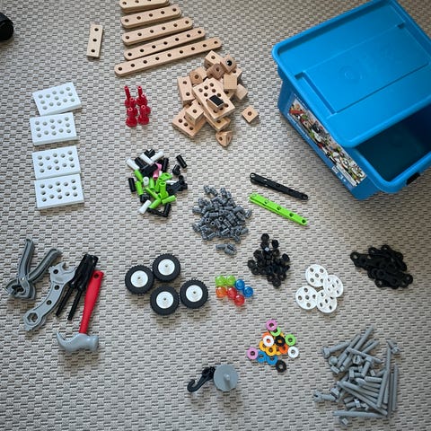 BRIO rakennussarja, jossa on erilaisia puu- ja muoviosia. Setissä näkyy muun muassa reikälevyjä, puupalikoita, renkaita, ruuveja, muttereita ja muita rakennusosia. Osista voi koota erilaisia ajoneuvoja ja rakennelmia. Soveltuu lapsille, jotka pitävät rakentelusta ja mekaanisista leluista. Ikäsuositus pakkauksen mukaan (ei tarkasti nähtävissä kuvissa).