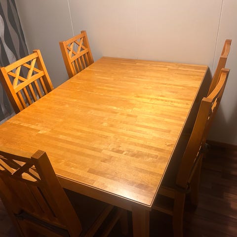 Askon hyväkuntoinen suorakaiteen muotoinen ruokapöytä ja kuusi tuolia.
