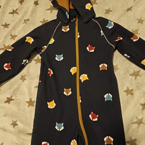 Name it haalari, koko 110. Monivärinen (kirjava) kuosi, materiaali polyesteriä. Haalarissa on huppu, jossa irrotettava tekoturkis. Ainoa miinus että haalarissa on aran värin vuoksi tullut likatahroja ja pientä tummentumaa. Voi lähteä kunnon pesussa. Haalari on vähänkäytetty kun jäi pieneksi kesken kauden.