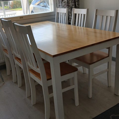 Myydään 6 hlö ruokailuryhmä. Pöytä ihan hyvässä kunnossa. Ei juurikaan jälkiä. Tuolit 6 kpl valkoinen keinonahka. Värjäytymiä. Siksi mustat päällysteet. Käteinen ja nouto.